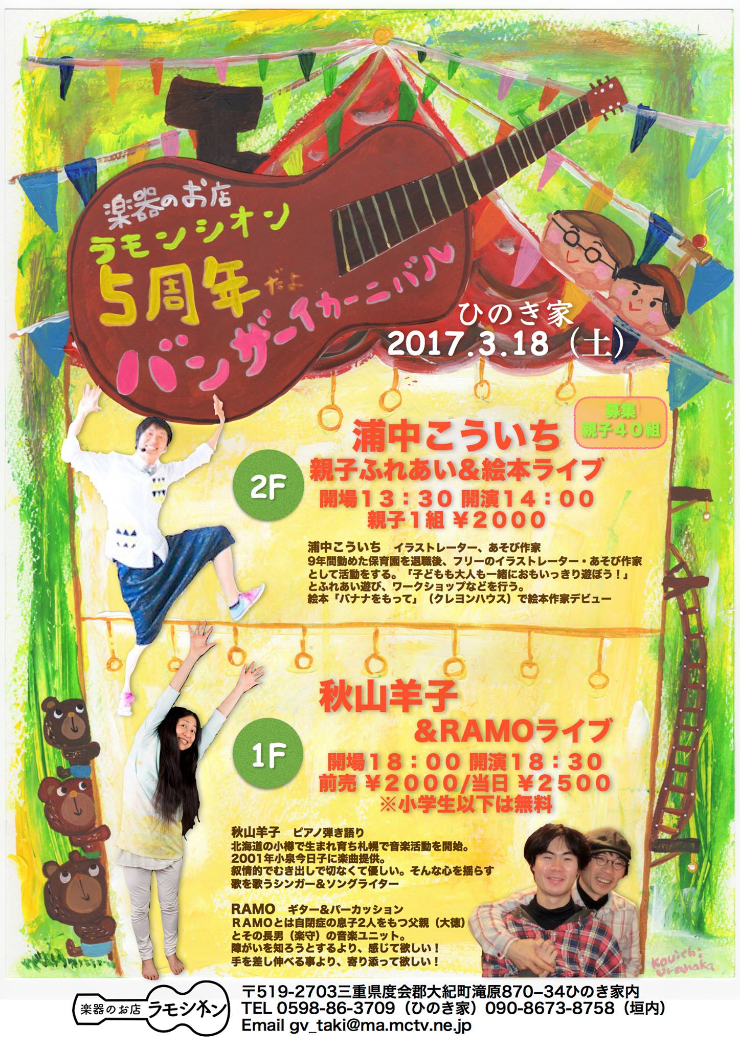| 2017.3.18 | HINOKIYA STOVE(三重県度会郡大紀町) | ラモシオン5周年バンザーイカーニバル 秋山羊子(vo, pf)、RAMO:垣内楽守(per, cho)、垣内“大徳”章伸(vo, gt) |