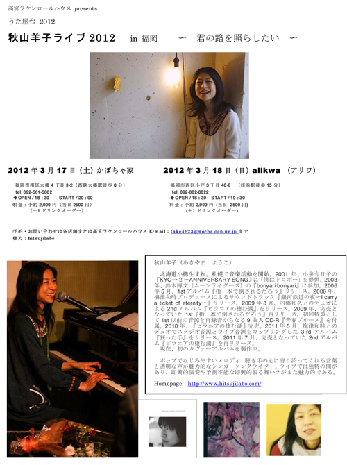 こちらは初出演。どうやらなかなかよいお店とのうわさをいっぱい耳にします。大村みさ子さんとの2マンでセッションもやります。きっときゅんと切ないライヴになりそうですよ。